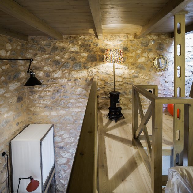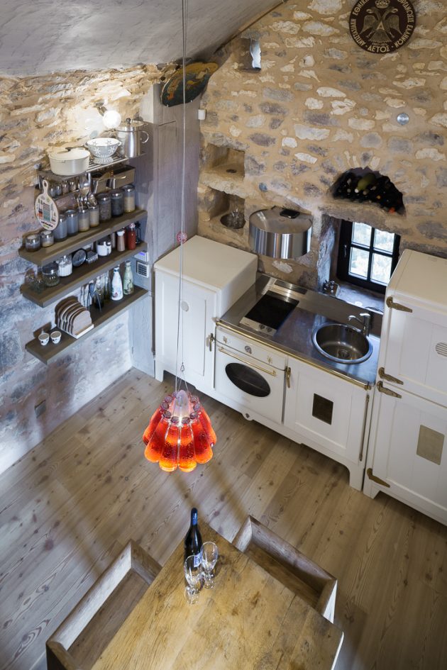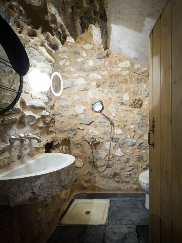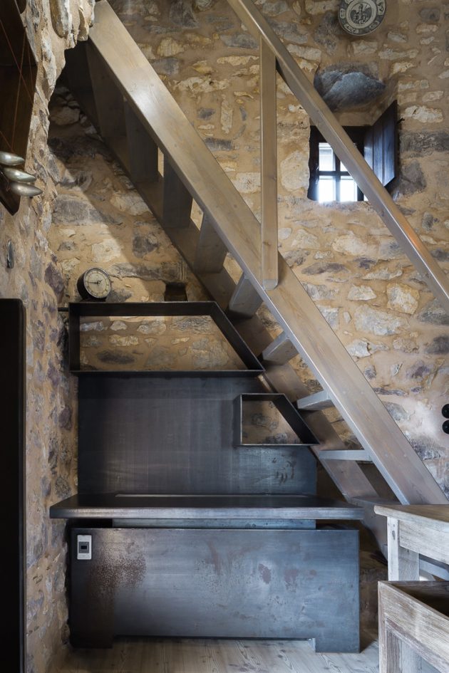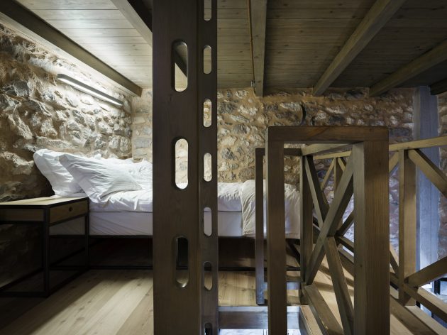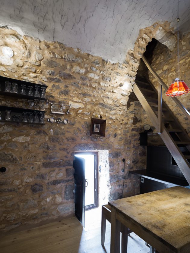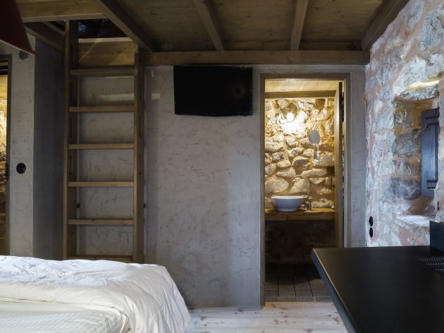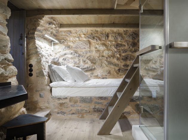 The conversion of the tower into a guest house had to overcome considerable difficulties. The reason was the need for a high degree of adaptation to the specific characteristics of the regional architecture and at the same time the demand for accommodation in rooms with modern aesthetic perception. The four floors, with their relatively limited interior spaces that comprise of three bedrooms with bathroom and shared kitchen, breakfast and reception space, are organized along a vertical axis, allowing guests to have the unique experience of moving through narrow openings (“waterfalls”), wooden stairs or rocks protruding from the walls and arches (“steps”).