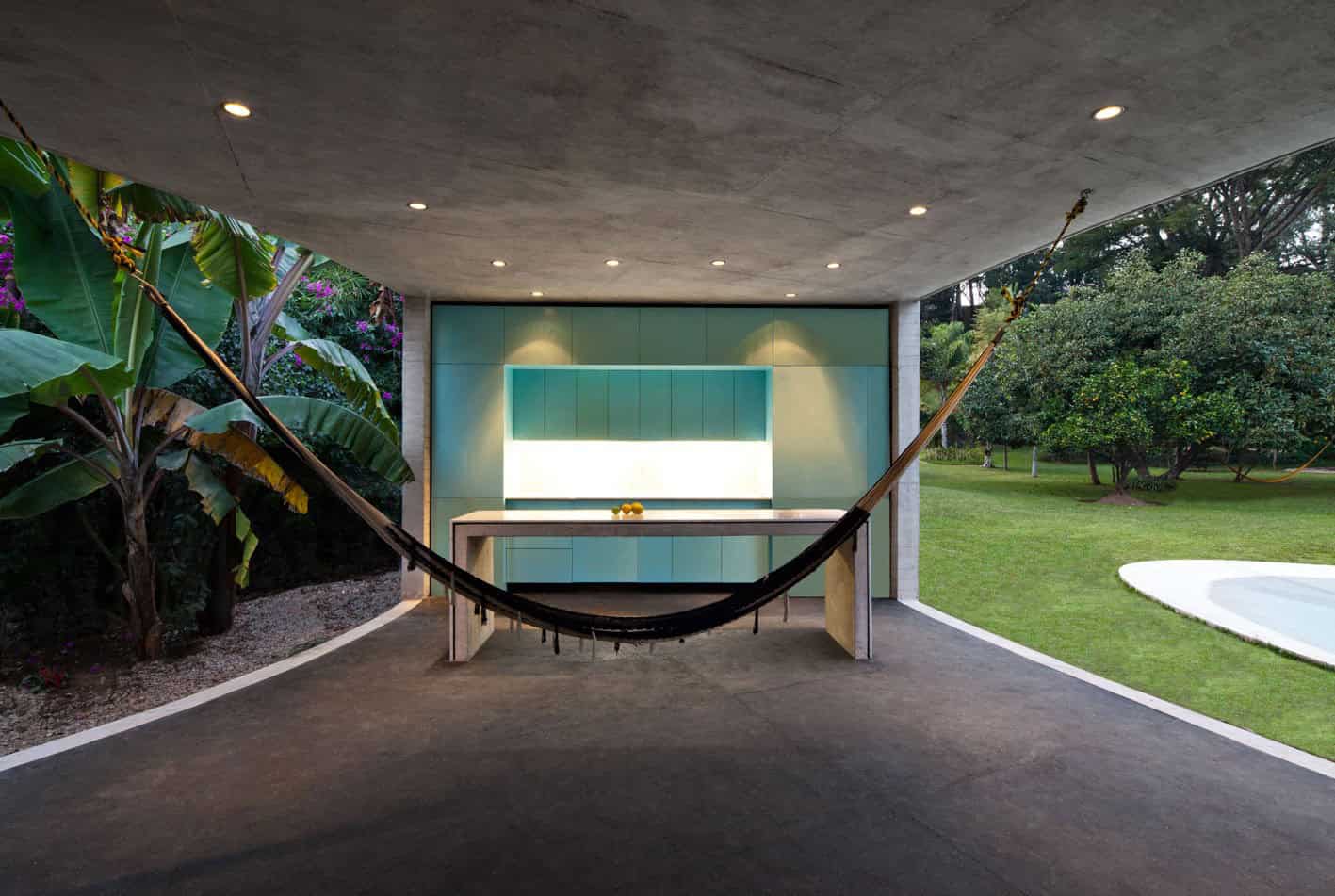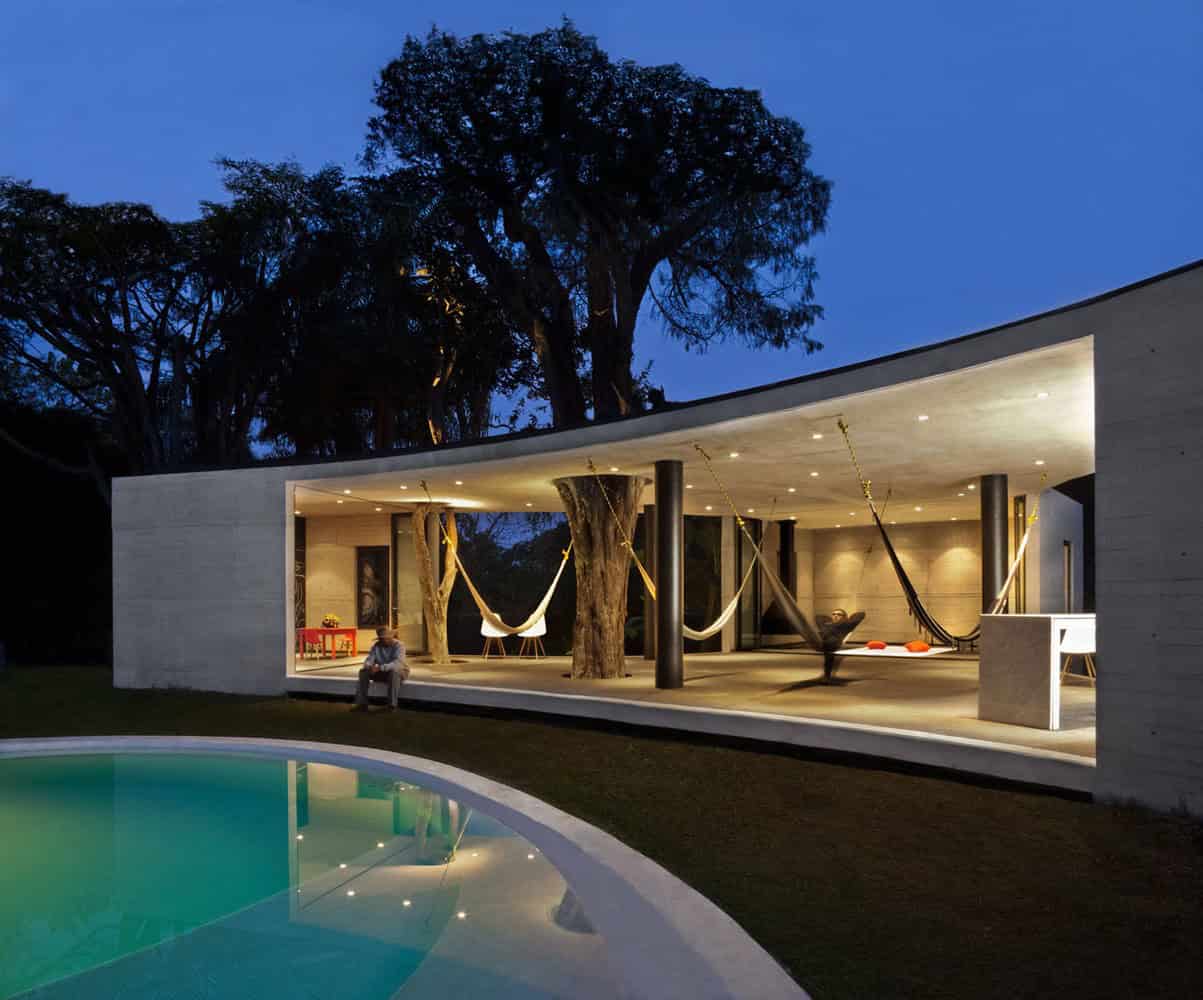 And it is through the definition of this central space, through the definition of its shape, that the contiguous courtyards are defined; those are as essential to the project as it is the built architecture, and allows constructing as a whole, single spatial experience. At the same time that the three built containers give continuity to the central space by mans of their use and space, the adjacent patios qualify it, while providing diversity and idiosyncrasy to open space. The design of the swimming pool is part of this same intervention, and responds to the desire to characterize the spaces; its formalization necessarily resonates the layout of the lounge, while incorporating to its nature the possibility of a multiplicity of ways of using water, and plunging on it.