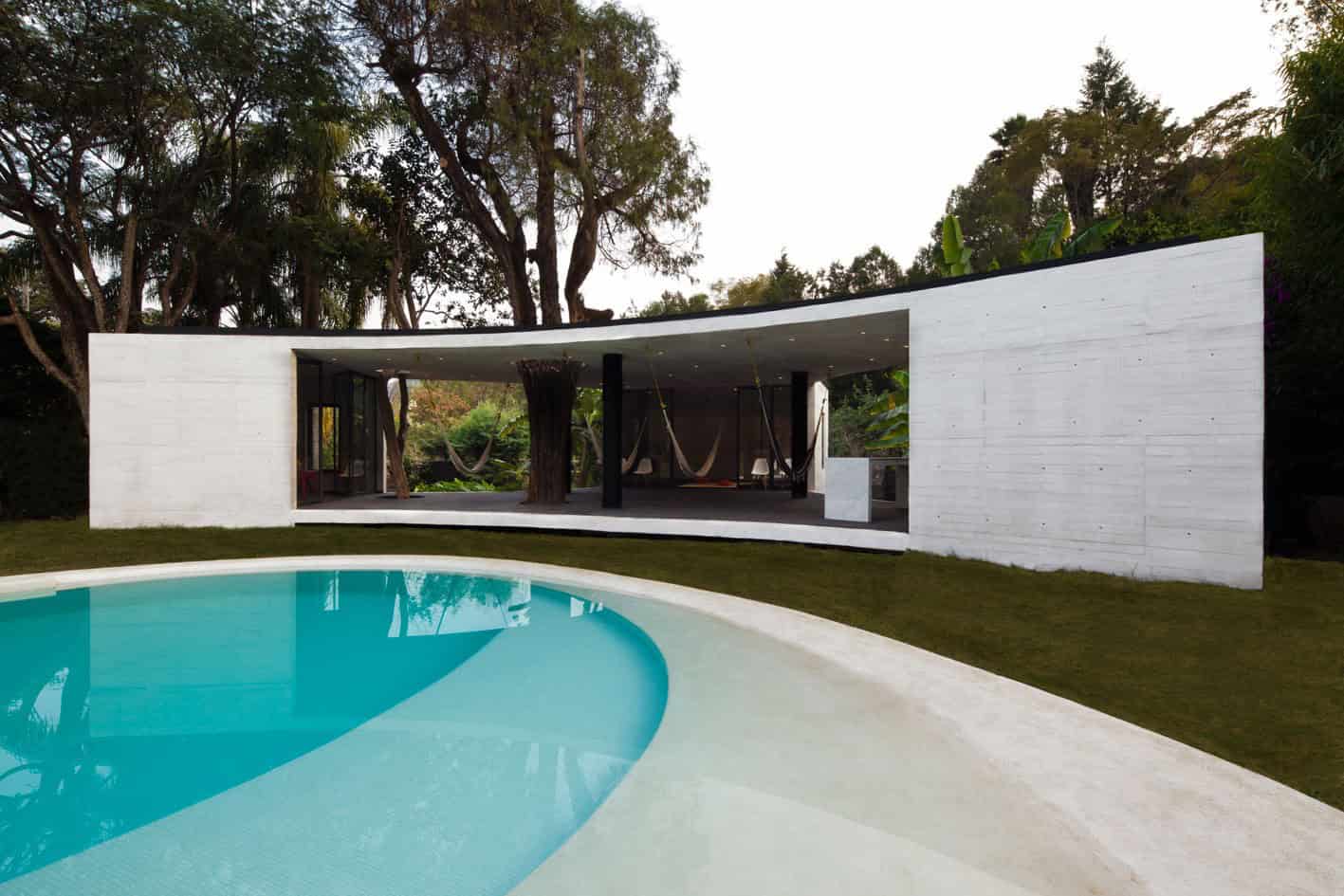 Modern minimalist villa with a sleek white concrete structure, outdoor swimming pool, and lush garden surrounded by tall trees, perfect for luxury outdoor living and contemporary architecture enthusiasts.