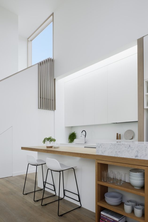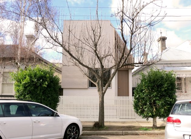 Tess + JJ’s House, located in Melbourne’s South Yarra, is a small two-story house designed by po-co Architecture. The brief was to create a home that could accommodate a young family of four, without upsetting the heritage context of the neighborhood. The design’s façade reinterprets the single window and front door arrangement of its Victorian period-style neighbors, creating an illusion of an over-scaled single-story house, blending quietly with the character of the street.