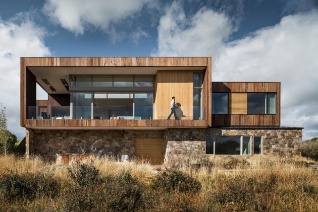 The material palette of earthen rock and stained wood works to tie the architecture to the tones, materials and textures of the region, all to help create an architecture that is derived from the site. The house, floating above the landscape, becomes a wonderful retreat in a truly unique environment.