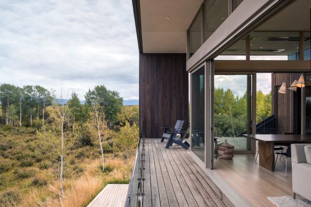 The architecture works in response by elevating utilities, structure and program to address the fluctuations of the site and to minimize the impact to the delicate ecosystem. Efforts were focused to preserve and restore the site’s diverse landscape by minimizing the building footprint – resulting in a compact, efficient layout which focused on building “up” instead of “out”. This strategy stays light on the ground and allows the primary programs of the house to raise above the wetland vegetation to take in all the site has to offer. The Grand Tetons become visible to the east and the trekking of moose becomes appreciable. The sky, landscape and wildlife change dramatically over the course of a day and a season.