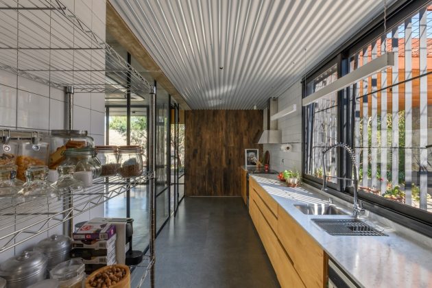 Volumetrically, it is made up of opaque perimeter enclosures, exposed concrete walls, cast in layers with different components in the dosage, giving it the appearance of geological strata. Above these walls, that form blocks that separate and contain, rests a slab made of precast concrete joists, that are manifested inside. Upper cover of aluminized sheet. This large “lid” is expressed as a rusted metal sheet border that runs around the perimeter and at some point it volumizes reaching the floor.