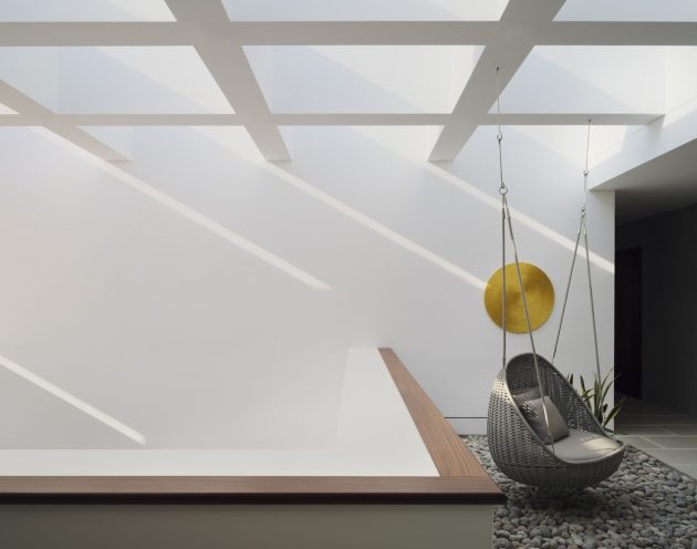 Once inside, the experience shifts dramatically. The architecture choreographs light from sunrise to sunset, flooding the home’s interiors through precisely oriented windows and skylights. One entrance opens into a calm pool patio through a large glass pivot door, while the principal entry unfolds beneath a 16-ft wide and deep double-height foyer capped by an expansive skylight.