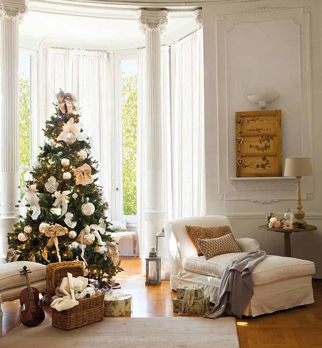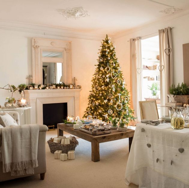 If your living room is white and a classic style predominates, decorate the Christmas tree and the coffee table with silver decorations: three balls, candles, gift wrapping… You will love the result!