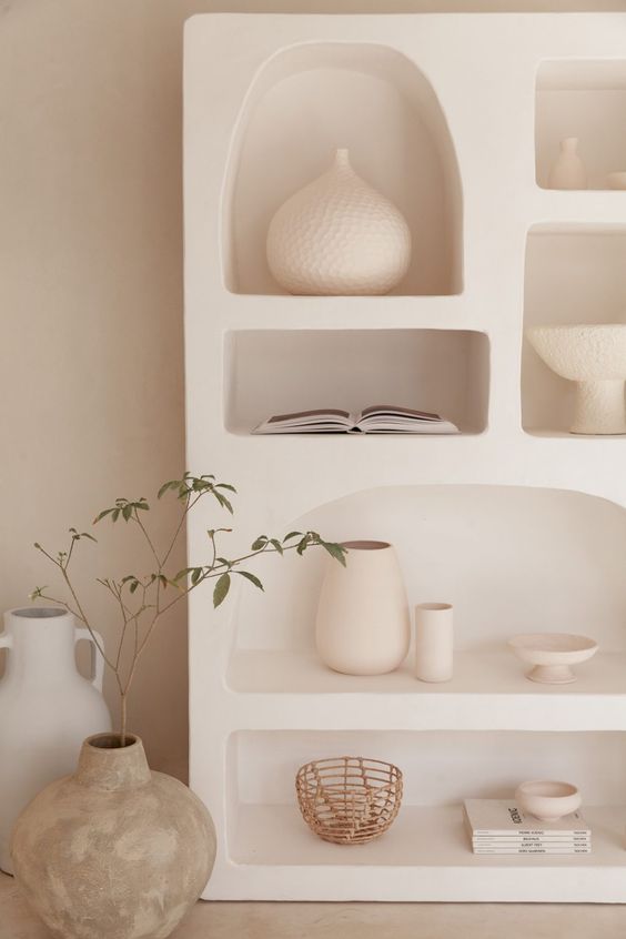 Decor tip: Put three to four items on each shelf and use something white to give each one a touch of serenity. The best objects for this are decorative statues and miniature busts.