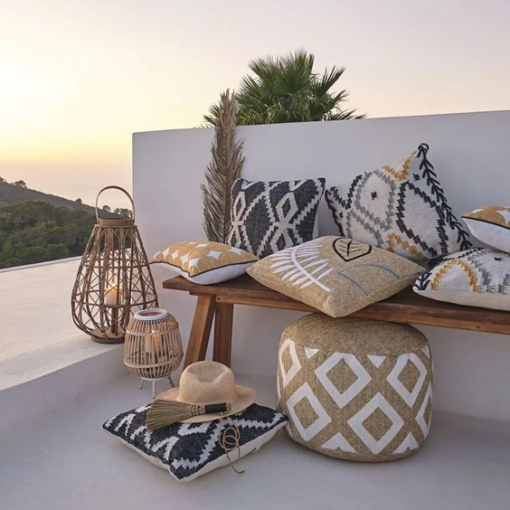 Why not go for a decor that advocates white and icy blue this summer season? A hand-woven rug in faded tones, linens in this colour palette and an ethnic-style cushion complete the set.