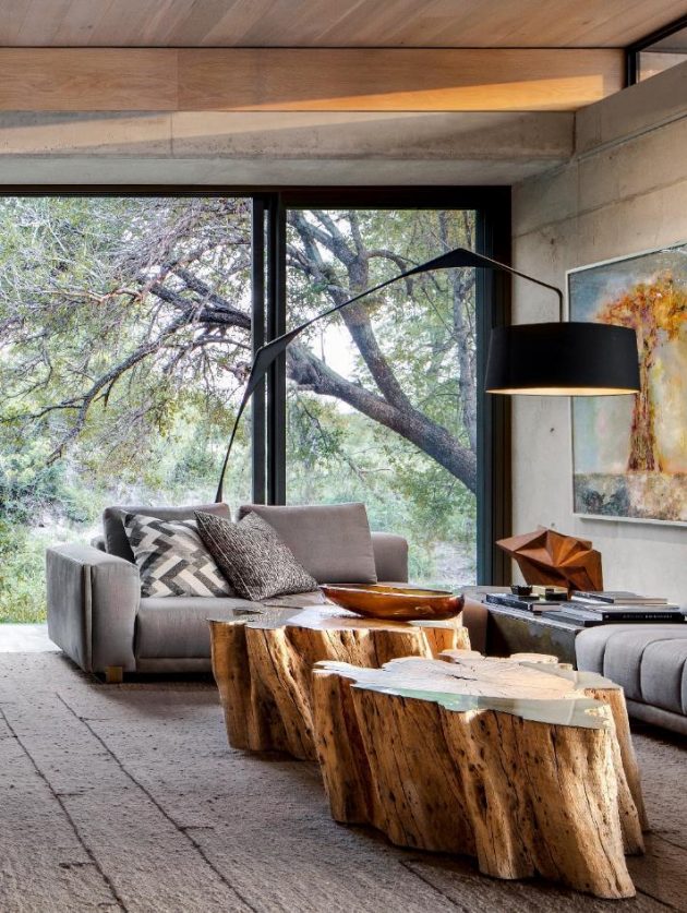 The project consists of three independent bush houses, named Mapogo, Mvula and Karula, each made up of several individual structures which include a central lounge, and dining room with bar area, a family media and entertainment room, a covered terrace, an open boma courtyard and separate freestanding bedroom suites.