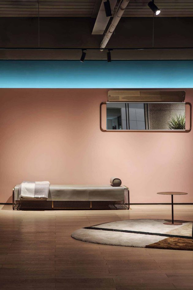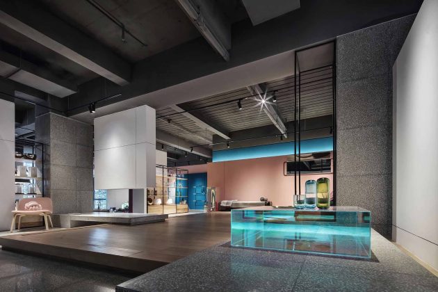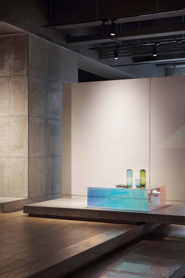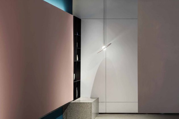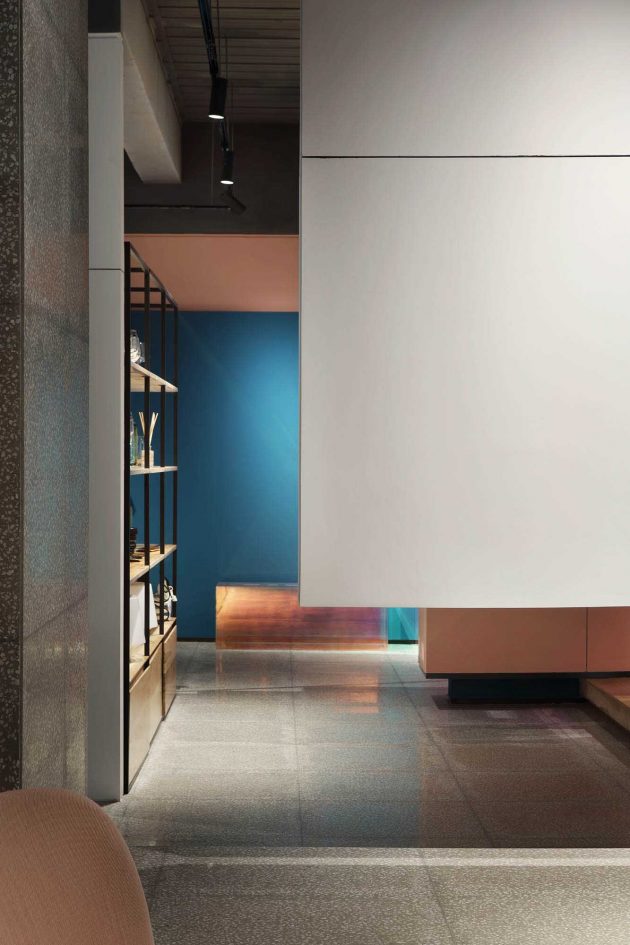 The designer makes use of contrasting cold and warm elements to better express the quality of the rich materials displayed in the furniture (leather, fabric, metal, etc.), by selecting a strong color contrast between serenity blue and rose quartz, as well as stone materials such as emery and terrazzo combined with warm wood floors. Through design, the space becomes integrated as a vast carrier for furniture, without losing ground to the merge of styles portrayed.