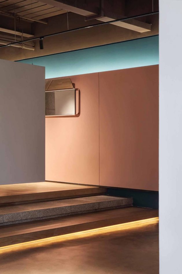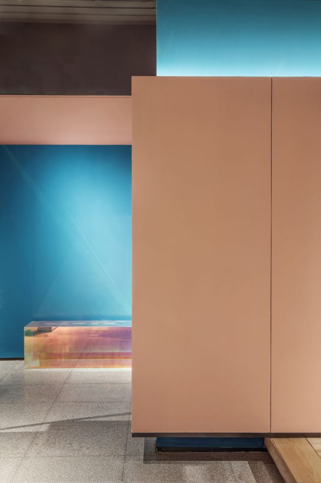 The match between serenity blue and rose quartz shortens the psychological interaction between the viewer and the space. Black, white and gray are used as the main tones of the atmosphere, where large blocks of contrasting colors attract the attention of visitors and provide them with a perfect background for photographs.