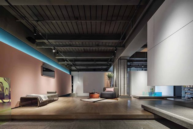 To increase the vividness of after-sale use in the customer’s mind, improve pleasant experiences and induce desire of purchase, the designer breaks the conventional divisions of space by using different partition forms to cut spatial order and portray the relationship between far and near, high and low, as well as visually intermingled areas that infiltrate space.