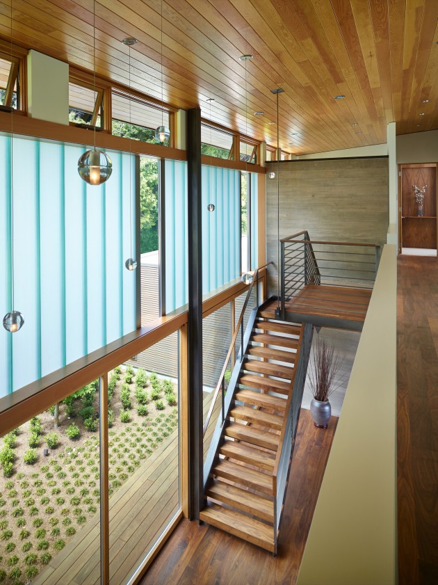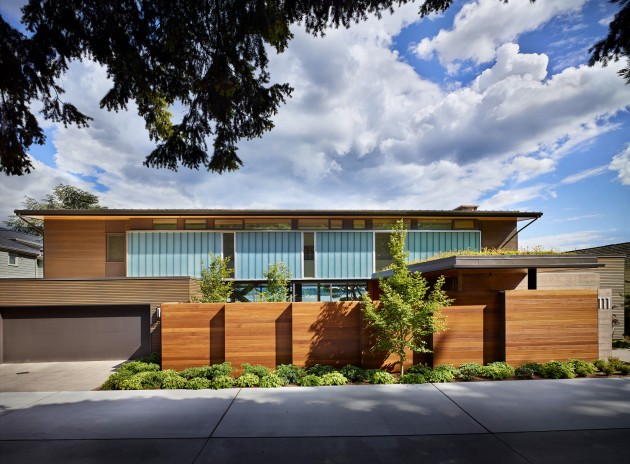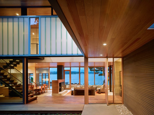 A narrow lane and Lake Washington surround the welcoming Courtyard House in Seattle. This home was designed by DeForest Architects for people that asked for a welcoming contemporary home that offers privacy and interaction between the outdoor and indoor areas.