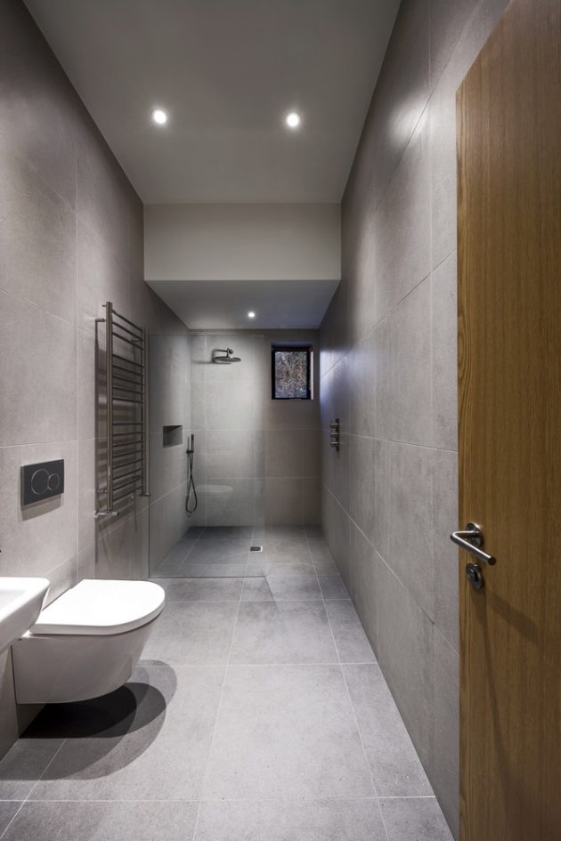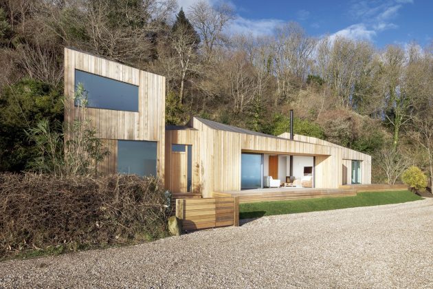 This modern home looks over a large cliff in Hampshire, offering beautiful views of the landscape from its light, airy interior design that has a slight modern cabin feel.
