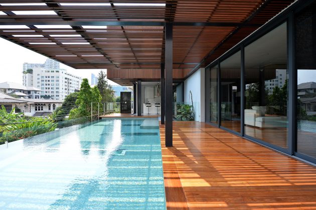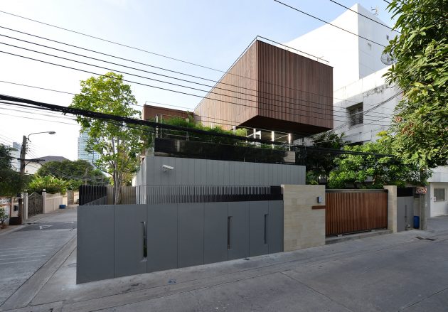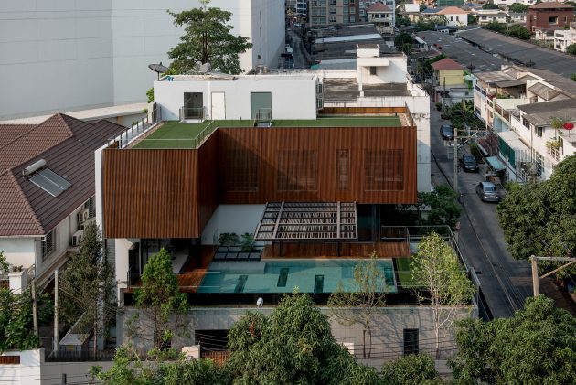 From the architects: “This three-story house for a family of four has a footprint of 250 square meters and a height of 11 meters. It is located on the street corner in one of the most exquisite and densely populated residential areas of Bangkok. Built with reinforced concrete and a partial steel frame, the project’s exterior is comprised of wood louver panels and exposed concrete. The retractable wood louvers on the third floor are designed using the analysis of the wind walls and shading device diagrams and can be adjusted for variations in the incident angle of sunlight.”