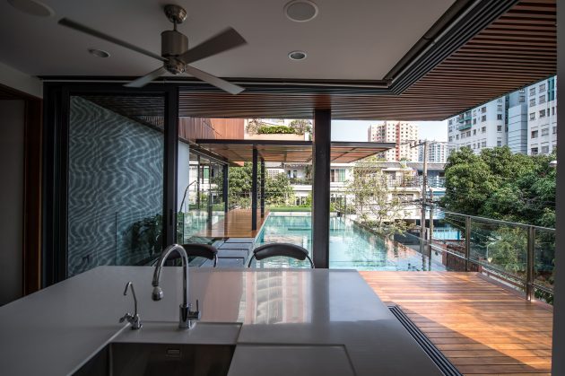 From the architects: “Combined with the wood louvers on the third floor, the glass louvers on the second floor surrounding the swimming pool courtyard help create an ambient of privacy for this corner house. The architects employed several tactics to bring ample natural light into the fully packed functional areas: bathrooms and living spaces are exposed to small courtyards while the swimming pool on the second floor has a glass bottom to allow natural light to permeate to the entrance and parking spaces.”