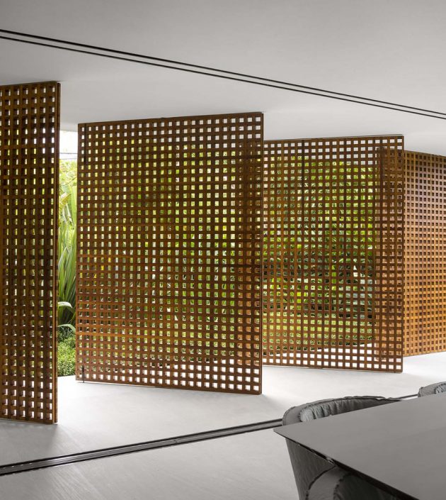 Perforated wooden doors provide shading while allowing breezes to flow, reducing heat gain without blocking natural airflow.