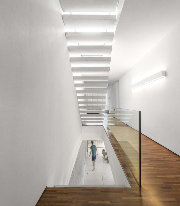 The first floor hosts the bedrooms, each oriented to maximize views and ventilation while maintaining privacy. Above, the roof terrace becomes a garden deck, offering panoramic views of the surrounding landscape. Accessible by an external staircase, this elevated retreat adds another dimension to outdoor living, echoing the coastal horizon.