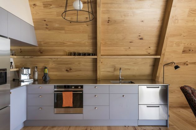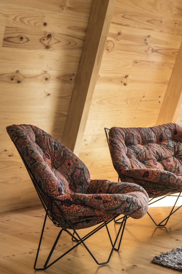 Each of the cabins has their own purpose, the main one being dedicated for the living areas, flanked by a similar structure housing the bedroom suite. Finally, the last cabin is dedicated to storage and additional sleeping areas. But the spotlight of this project shines on the courtyard formed by a deck with a sunken patio with a dining table, benches, a barbecue and a hot tub.
