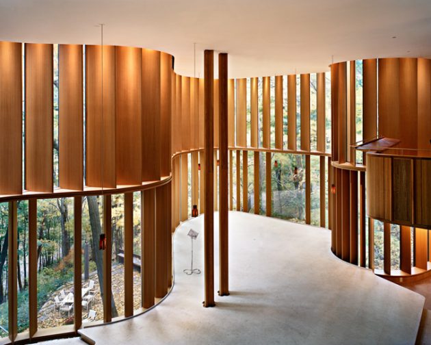 From the architects: “This project creates a new place for architecture, music and performance in Toronto at the edge of one of its verdant ravines. Curvilinear, undulating glass walls with syncopated oak fins are used to shape a large gathering space where building and landscape are intertwined. The journey through the house parallels the experience of descending the ravine slope taking advantage of the sectional qualities of the site and amplify the journey through the project”
