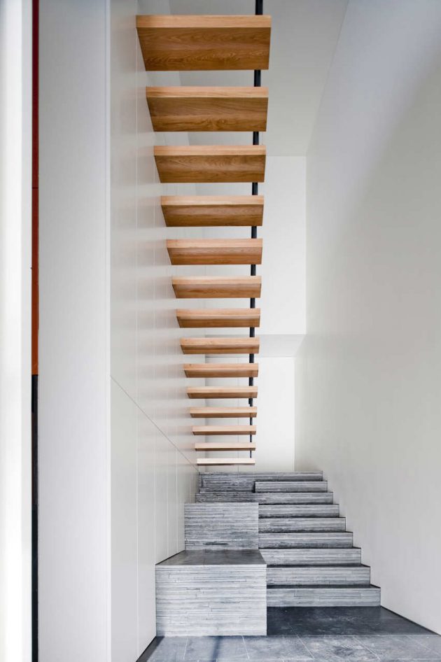 From the architects: “The house and the garden are part of the same spatial entity in the way one may dwell in the house and enjoy both its exterior and interior spaces and their multiple inter-relations. This is also manifested by a white wall that brings together circulation and the different spaces of the ground floor, from the entrance, through the circulation long axis, the living room and into the garden, wrapping the music room and then folding back to the living/dining room, where the family may gather. The family main social areas are located on the ground floor. The several spaces on the ground floor have also different headroom, thus emphasizing the different ambiences of the house. The stair that connects both floors only has threads and therefore becomes a visual filter between the entrance and the living room and the garden. One consists as a plastic and transparent element, assuming distinct materiality. It is more massive binding on the lower levels and more transparent binding to the first floor, contributing to filter visually the light that comes from the living area.”