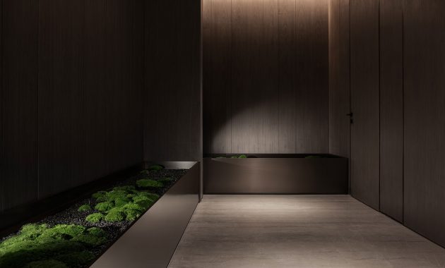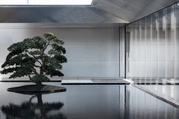 Design is meant to properly meet the people’s current demands for function and emotion. In Li’s case, design expresses his own expectations of life, through the way the space is presented and shared with others. In order to ensure a unique and smooth landscape, designer Lee Wei Min divides the space into three parts: the reception and art exhibition area is the first part, the next is the sand table area, and the last is the wine area. Through the building screen’s axis and the courtyard waterscape, into the reception area of the living hall, green plants are arranged in order to create a mysterious sense of ceremony and order, so that the reception platform stands in suspension, turning the atmosphere to one of relaxed nature. In addition, walls in the reception area are covered with wood and other more natural colors, forming a buffer. “Even if the space has a lot of turning points without visual stagnation, it is nonetheless a conversion and extension.” Lee notes.
