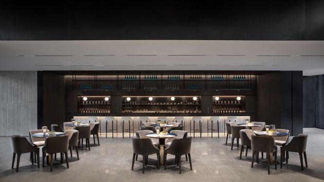 In the overall tone palette, with a warm neutral color base, furniture is presented in the form of art, with color to create a humanistic, artistic atmosphere, breaking the boundary between space and nature. The moving lines in the sand table area abound in different space levels, at the same time the floating island terrace of the outdoor waterscape acts as an extension of the indoor space, creating the poetic feeling of a Hangzhou court. The long strips of water at the entrance reception table echo each other. The main wall at the bar, while fulfilling the visual aesthetics, combines with the art chandelier so that wine tasting and conversation become a romantic encounter.
