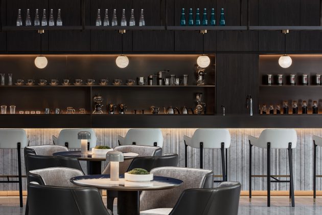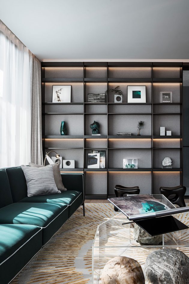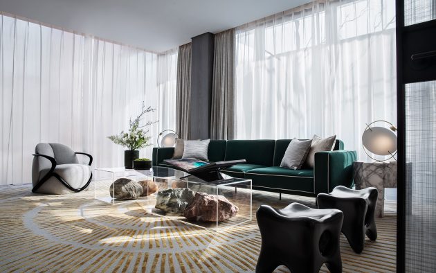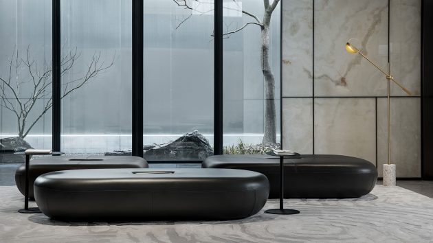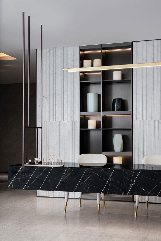 The word “humanism” is the essence of the way of life overarching the oriental cultural tradition. Lee captures that humanistic spirit extremely acutely. In the physical overhead floor area, the designer links the landscape, architecture and interior by means of transition, creating a profoundly ceremonial entry space, which is used for public interaction. A multi-dimensional interactive space, often the life-oriented expression of blending art, here advocates neighbors’ communication and sharing of community, and forms an aesthetic space with a pyrotechnic atmosphere. In addition, light guides the moving line of the space, strengthening the design space’s order and appeal, continuing the elegant, extravagantly lively atmosphere.