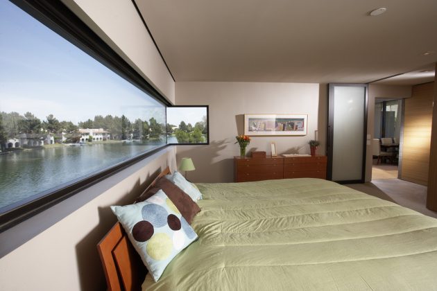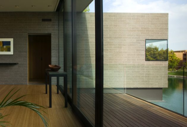From the architects: “The 21st century ecologically sensitive Lake residence designed by Architekton is sympathetic to its 20th Century neighbors and is a mix of reverence and daring. The 3,500 sf home was specifically designed for a family of four (and two beagles and a cat) on an 8,200 sf lot in the first lake community in Arizona. The new home was built on the last vacant lot in the 30-year-old Lakes Neighborhood in Tempe Arizona. The site was chosen for its’ views, north-south orientation, quality of schools and close proximity the family’s places of work. The goal was to create a livable, sustainable contemporary home, which could evolve over the family’s lifetime.”