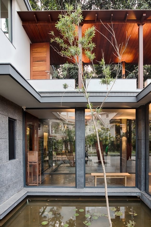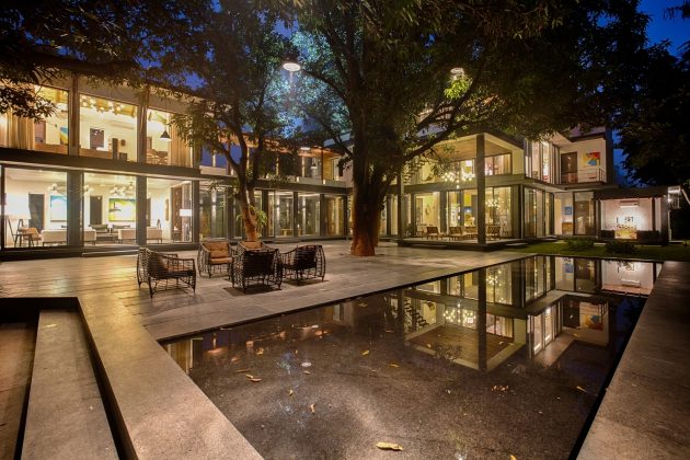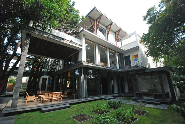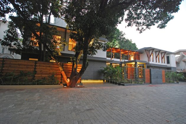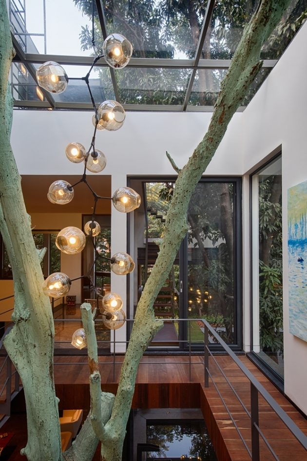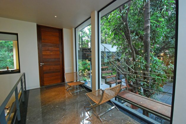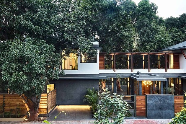 The Mango Tree House is a unique private residence in Bhopal, India, built around large mango trees that are 50 years old. The design is inspired by the experience of being surrounded by the trees and the architects sought to create private living spaces while maintaining the feeling of being among the foliage.