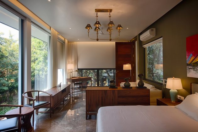 The house consists of two blocks connected by passages and features a solid wall envelope with spaces designed as pavilions facing the trees and large glass walls, tall openings, and flat ceilings to blur the boundaries between inside and outside. The use of materials such as cotton white walls and uniform granite stone flooring enhance the experience of being connected to the landscape. The lighting design emphasizes the continuity of spaces towards the trees, creating delightful transitions throughout the day.