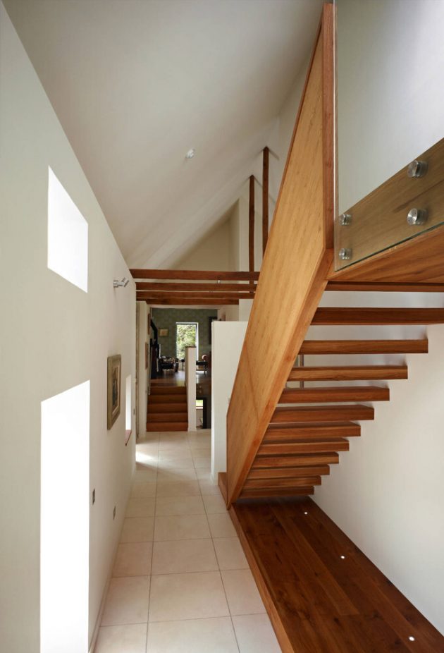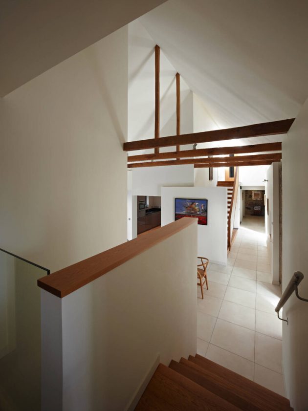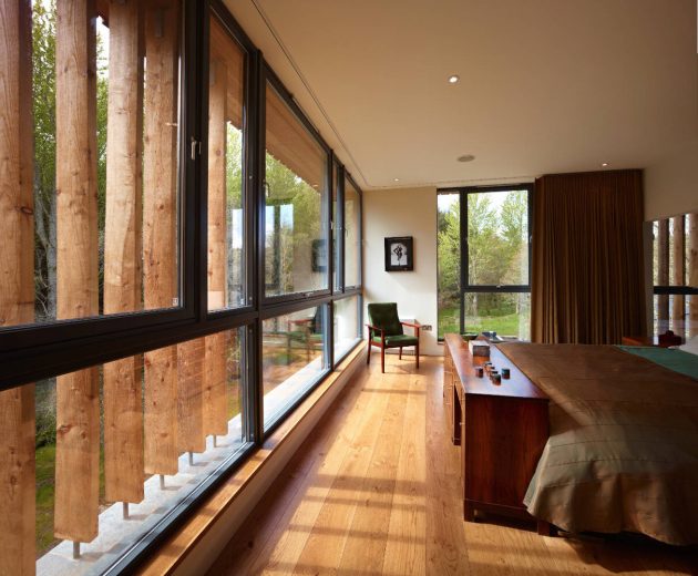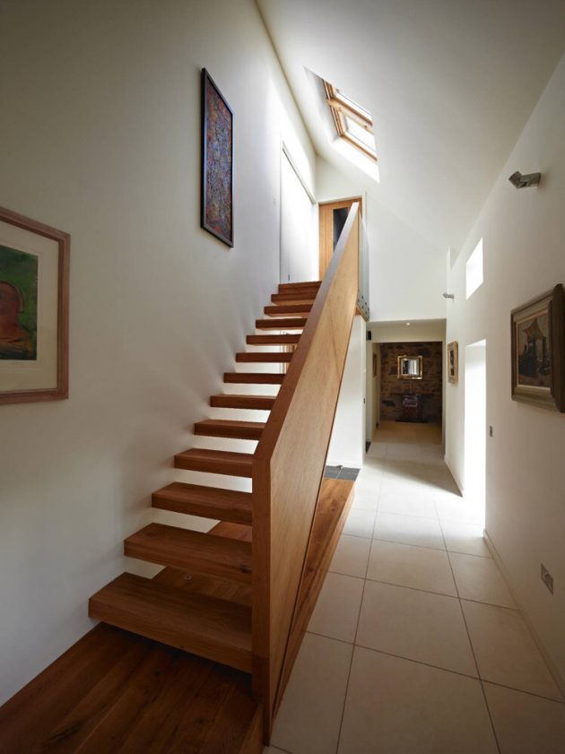 A three story timber “tower” sits at the southernmost part of the house, rising from formal dining room, to sitting room, to master bedroom, which has a high level 270 degree view of the wider countryside. The master bedroom is accessed by a stair that floats alongside the old rough stone walls, and cantilevers out from a massive larch wall.