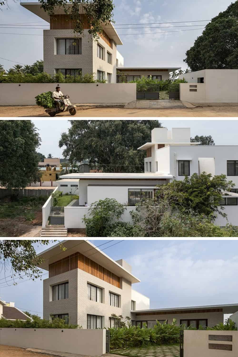Spanning 6,000 square feet, the home blends contemporary lines with mid-century modern influences. Horizontal planes, glass façades, and overhanging cantilevered roofs define the form, creating openness while providing shade. The use of white brick cladding, sleek aluminum windows, and recycled teak wood panels recalls both modernist purity and temple-inspired motifs, notably referencing the intricate chariot carvings of the nearby shrine.