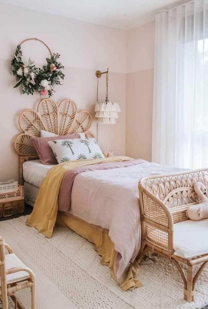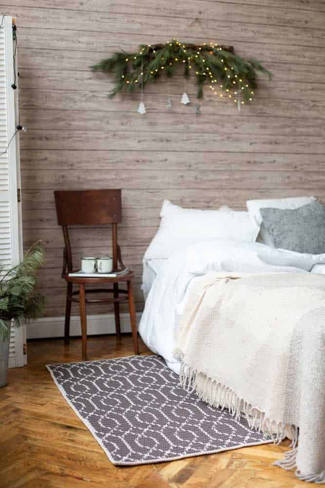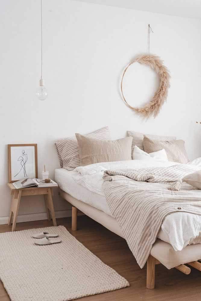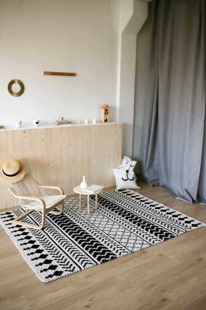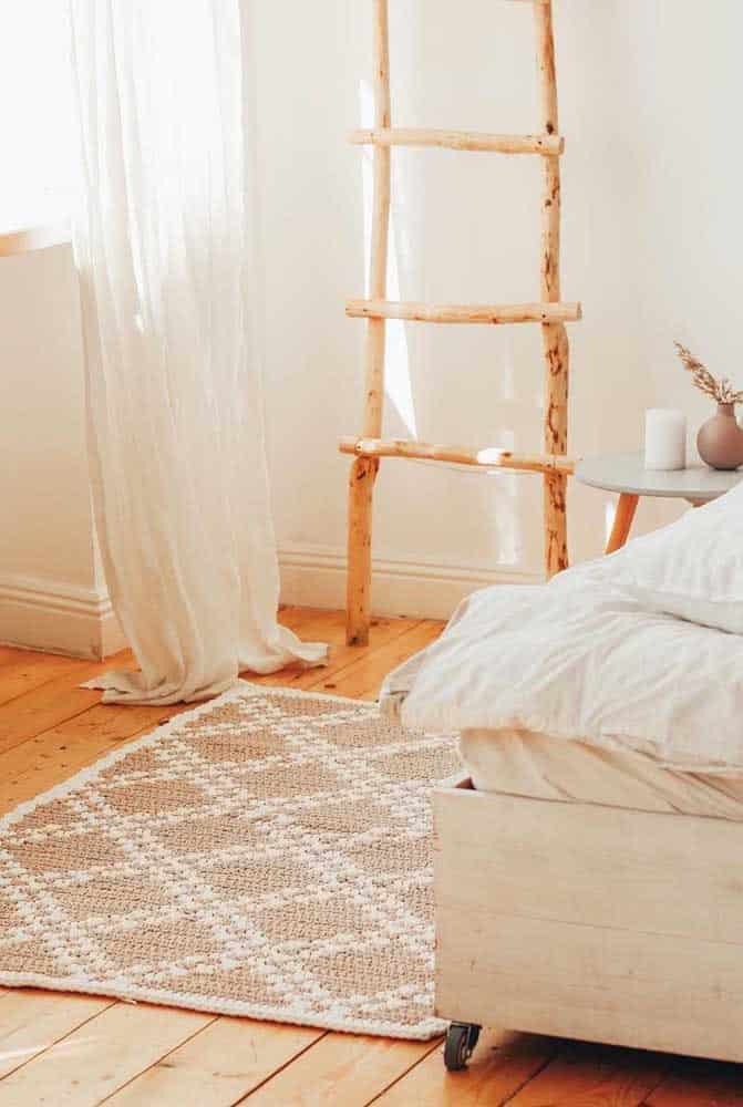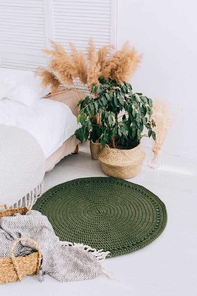 A boho-style bedroom looks beautiful with a crochet rug made from raw string.