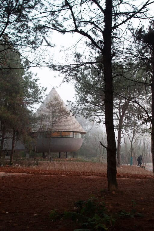 The Mushroom house adopts a lifted steel structure to minimize the impact of construction on the site. As time goes by, green plants on the ground will gradually spread to embrace the building. The cone-shape roof is cladded with pine woods, while the rest of the house is coated with granolithic concrete. The material changes in color with humidity and time, allowing the building to harmonize with the surrounding natural environment.