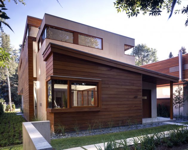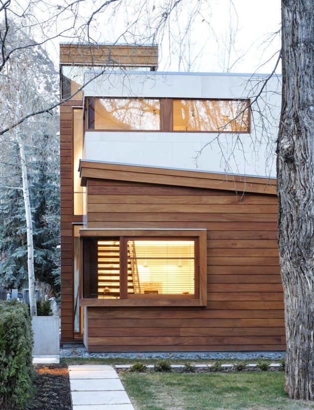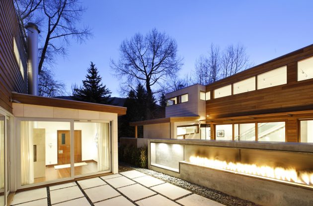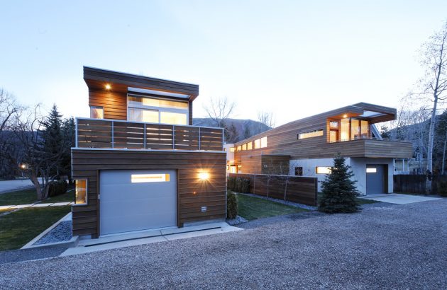 Studio B Architects – an Aspen-based architectural firm has designed two, twin 3,500 sq ft homes in Aspen, Colorado. Basically, the two single-family residences are located on a corner lot in Aspen’s West End neighborhood. They divide the property into equal halves and draw a line right down the double courtyard in the middle.