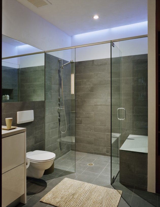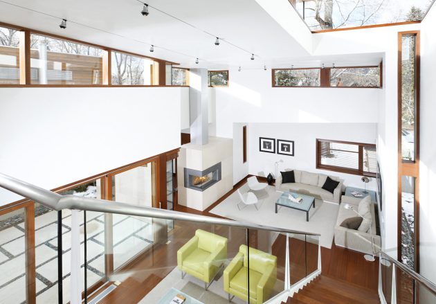 From the architects: “This project consists of two adjoined and related cousins on a corner site and is often thought of as a ‘sibling rivalry’. They sit quietly in the historic section of Aspen and their massing responds to the contextual rhythm. The two houses divide the property equally and draw a line through the sand via a concrete demising wall. This concrete divider yields privacy from one another, defines the patios and carries a fire element to warm the terraces on cool summer evenings. The residences are within easy walking distance of Aspen’s numerous cultural institutions and are inter-related in their posture and appearance. Because of their close proximity, the window patterns were carefully composed insuring privacy from both levels and terraces. The exterior material palate is simple yet elegant and is comprised of Italian marble slabs, mahogany siding with reveal details adding a depth to the skin and aluminum-clad doors and windows. A large double height space unites the interior of each house, serves as a gathering space, fills it with light, and contains ample wall space for art. The bold interior surfaces are contrasted by the warmth of the wood floors, casework and furniture.”