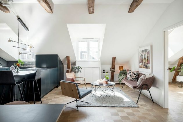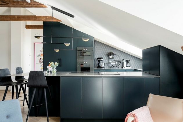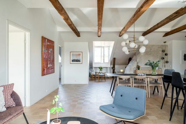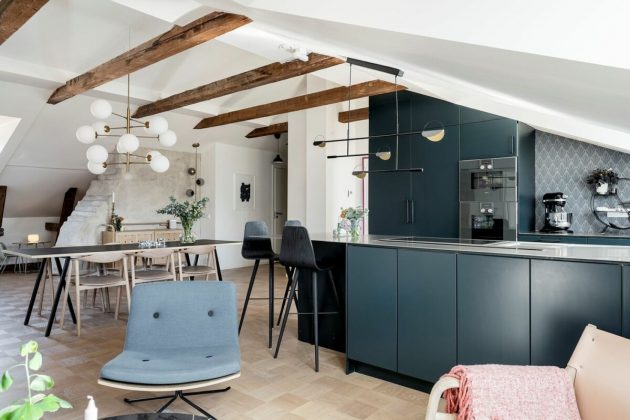 Take a good look at each corner of this kitchen opens to the living room because there are several lamps scattered around the space, can you locate them all? Do you have many lamps scattered around the room? Do you leave the cord of the hanging lamps over the longest dining table, as the Nordics do?
