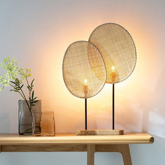 From a distance, it looks like lace, so fine and graceful is this rattan table lamp! The oblique braiding gives a feeling of movement to the lampshade, held on its black metal base. Inside, you can place a low-consumption LED bulb or a halogen bulb.
