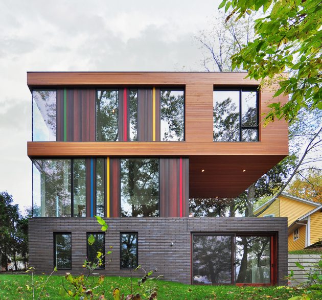 The cube is clad in horizontal cedar siding, complemented by vertical cedar inserts around recessed apertures. Narrow painted boards add an unexpected filigree of colors, referencing the polychrome threads of the client’s textile work. This subtle play of tones animates the façade, enriching the restrained geometry with a layer of artistry.