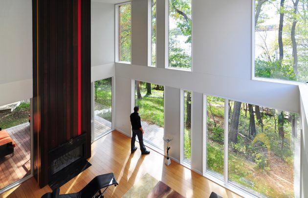 • A double-height living room, where vertical apertures stack to reveal skyward and treetop perspectives.