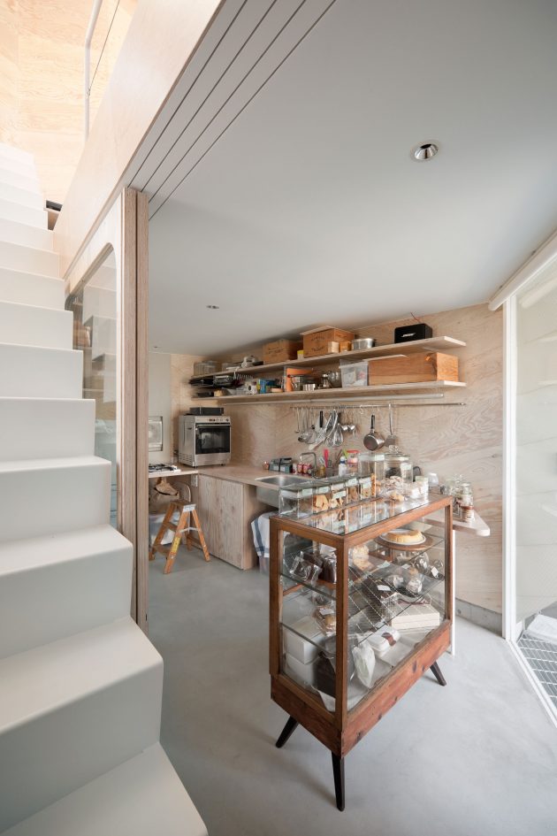 Footprint of this house, including the biscuit shop that is part of the house, is only 26m2. The entire house is divided into seven split levels without partitions and all levels are connected by a staircase situated in the middle of the house. From the shop on the ground floor, this metal staircase connects the kitchen and the dining on 1.5 level, then the living space on 2 level, and finally the sleeping area on the top floor that is shared by all family members. A second set of concrete steps continue from the ground floor to the basement, housing the shop and its bathroom.