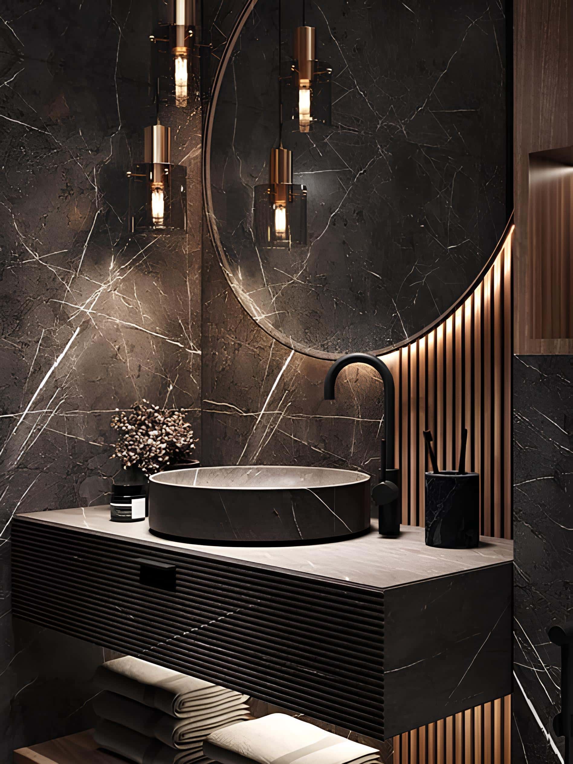 Luxury Dark Marble Bathroom with Gold Lighting