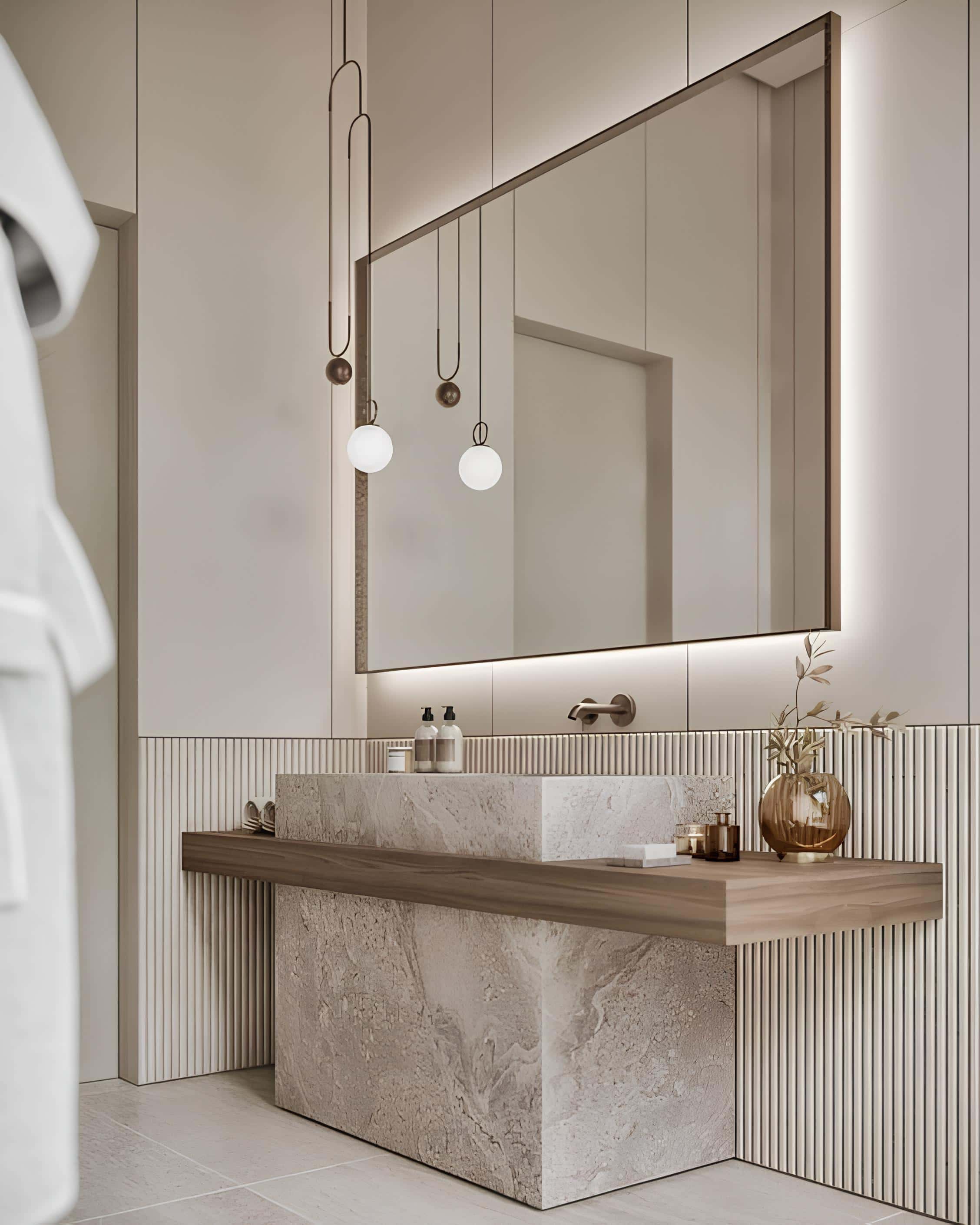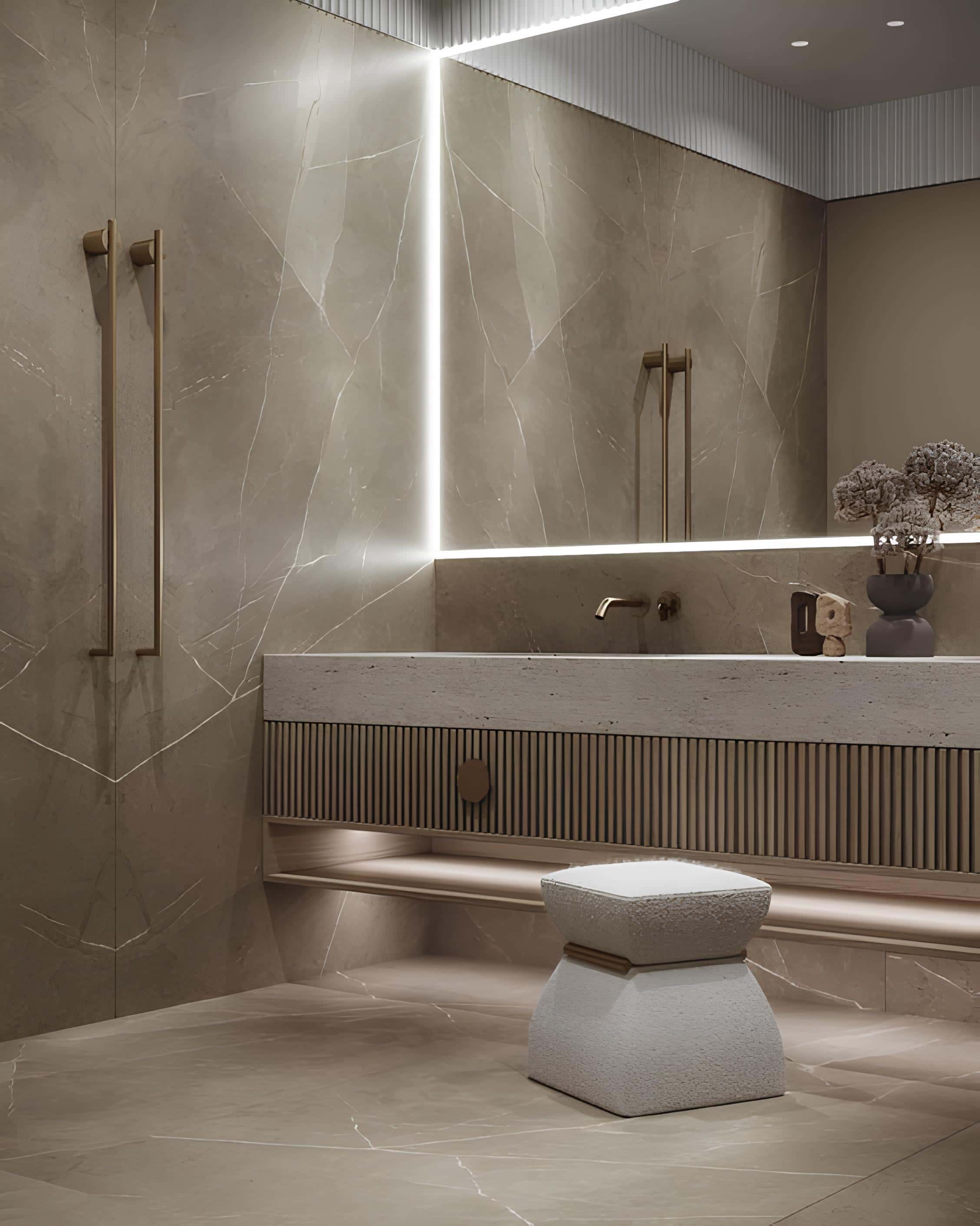 Modern spa-like bathroom with a stone sink, neutral tones, and ambient LED lighting.