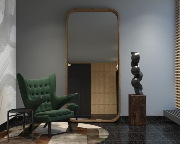 The bold “Ocean Blue” porcelain of the Italian brand ‘’Apavisa’’ is used on the floor. In the living area, wood-like ceramics has been applied to make it easy to use and add warmth. On the fireplace wall, ‘’Arte Wallpapers’’ brand green “Facet” wallpaper and different rows of bricks were applied. The brick wall is animated with cubist artworks reflecting Berlin. A warm sitting corner was created with the original seating elements of ‘’Adasan Furniture’’. With ‘’Dr.Light’’ brand lighting, the retro atmosphere desired to be created in the space is reinforced.