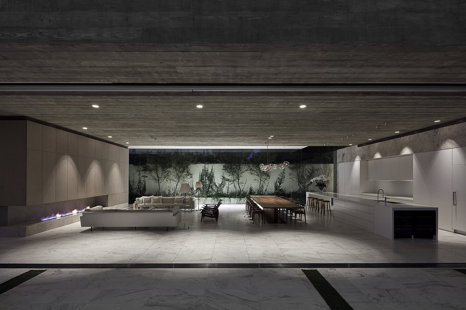 Natural timbers and stone culminate in a series of concrete and glass volumes that create free-flowing spaces providing easily interchangeable areas for family living as well as formal celebrations.