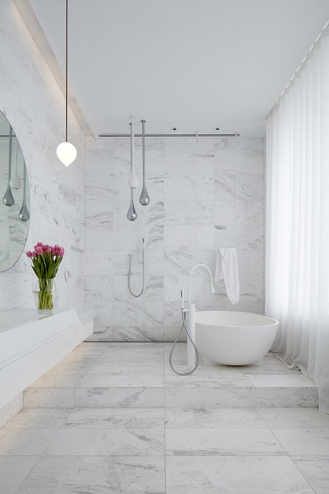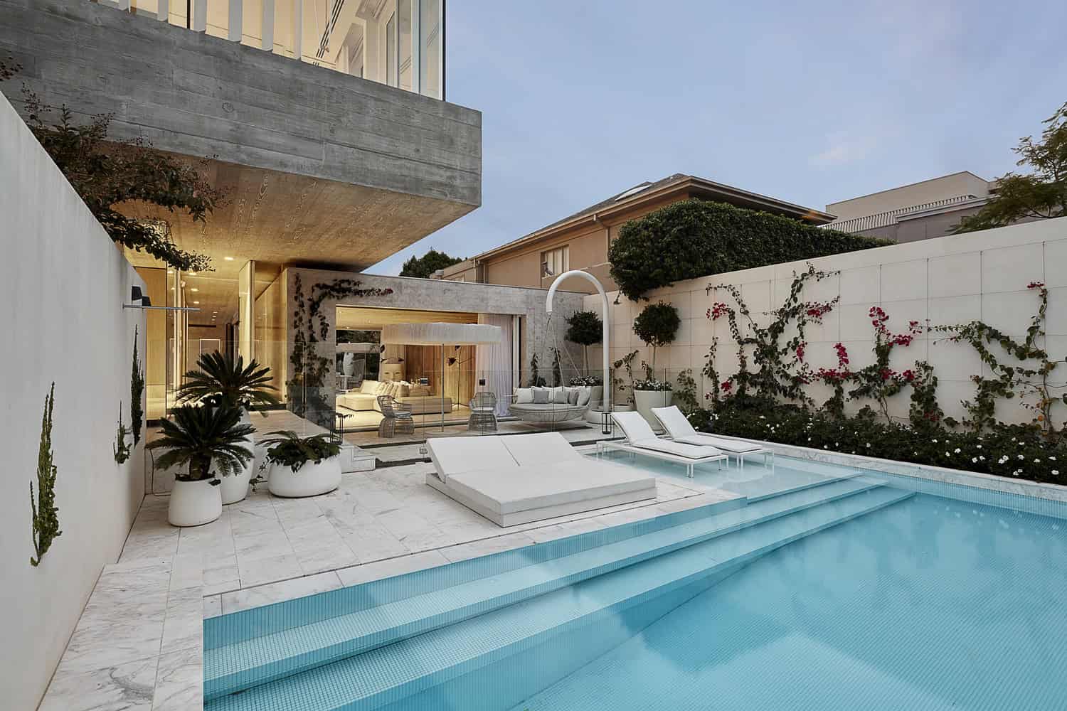 The outdoor area was designed to accommodate a large pool that fits beautifully into the marble tiling. The use of outdoor greenery and an all white colour palate gives the outdoor space the impression of an exotic oasis located in inner-city Melbourne.