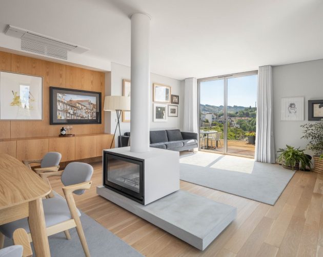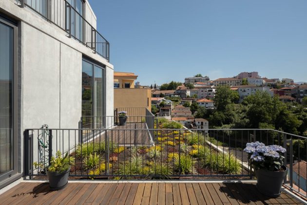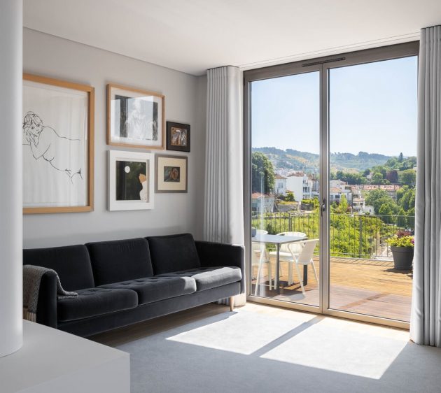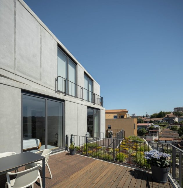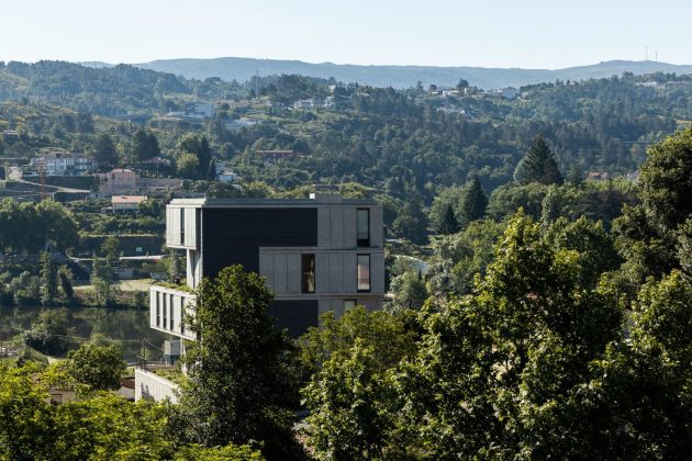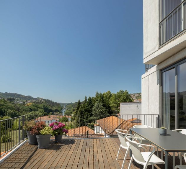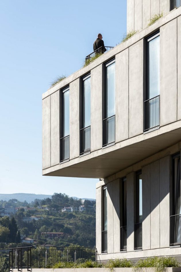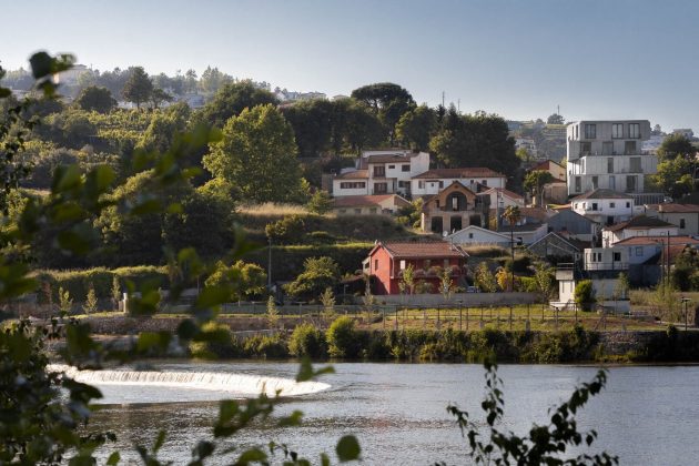 The form taken is based on an understanding of the place and its surroundings, and the ground floor seeks a more honest relationship with the ground at low level, assuming a regular basis in relation to the street front, and thus allowing that the other floors were reflecting the various influences of the surroundings, thus creating different framing points for each floor and the dwellings, thus giving them a unique and distinctive character, with each dwelling being an element with its own identities and characteristics. This play of volumes not only provokes distinct landscape framings, but also allows for unique outdoor spaces, as this space is always intimately linked to the relationship between the roof on the lower floor and the pavement slab on the upper floor.