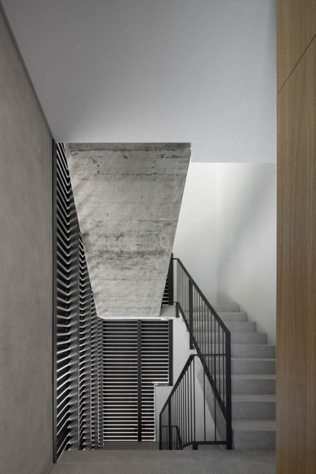 In this context, the stairwell and vertical communications play an important role as they define the street front, aggregating all the floors and stabilizing an elevation quite marked by the movement and tensions resulting from these torsions.