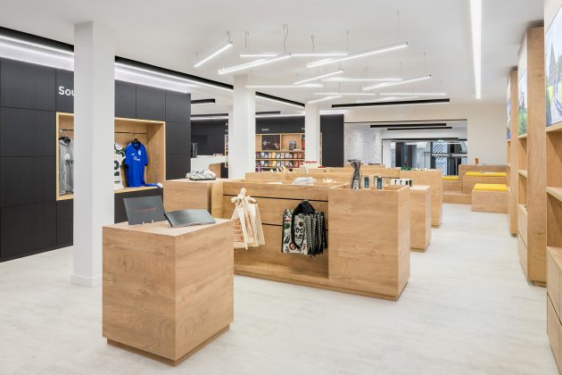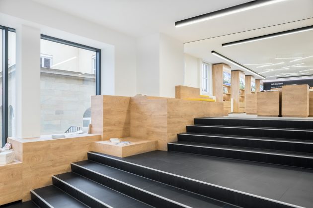Visitors will get an overview of the space immediately upon entry and are guided through the area intuitively. Looking straight ahead reveals a spacious staircase that serves as the connecting element between the lower and upper retail space. On the right side, visitors can approach the constantly manned reception desk or obtain current information via the screen integrated into the wall. On the left side, a window display, which can be seen from the outside, stretches along the facade, up the staircase, and into an inviting seating area. This display forms the start of a row of cube-shaped wall shelves and merchandise display units for retail and presentation. These shelves and display units are designed and arranged specifically for the products to encourage visitors to browse. The pendant lights used here highlight the merchandise on display and constitute an impressive light installation on their own. The rest of the space is illuminated by black surface-mounted ceiling lights with a graphical appearance to create a neutral atmosphere. There are likewise two pieces of service furniture available on the upper level – including seating furniture where necessary – for providing information and advice.
