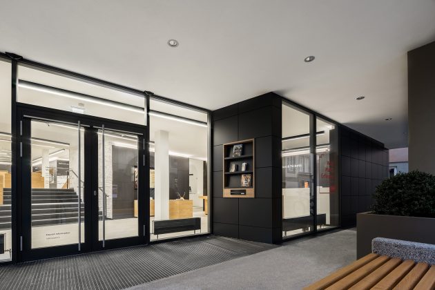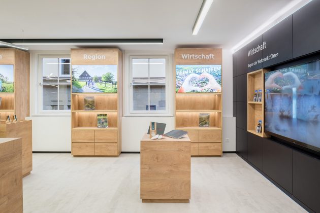 The colour and material concept revolves around a light-dark contrast and natural colours. The anthracite-coloured corporate wall surrounding the space is a design element that establishes the space’s identity and connects the individual zones together. At the same time, it offers additional uses by providing room for shelves, noticeboards, displays, window displays and storage space as well as functioning as an acoustic barrier. This, in combination with oak furniture, bright flooring and a white suspended ceiling, creates a friendly, modern atmosphere. The colours are reversed in the staircase area, making the backlit line art with motifs of the city of Schwäbisch Hall fully come alive. Multimedia screens, digital panels and high-quality photographic images are placed throughout the entire space and complete the image of the city.